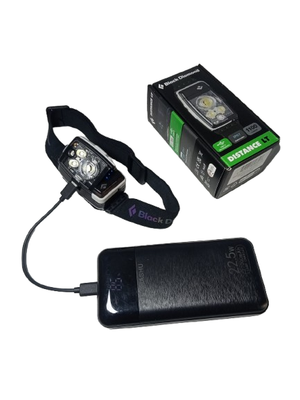 Per ricaricare la batteria della Black Diamond LT1100 ho utilizzato un Power Bank da 27.000 mAh, con due porte USB e due porte USB C, che misura 15x8x3cm, e pesa sui 350gr.
