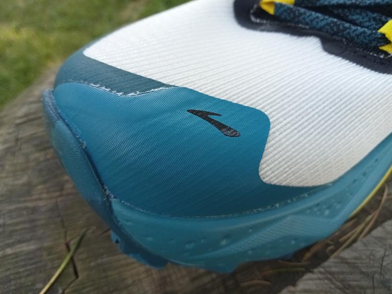 Il contrafforte tallonare è dotato di conchiglia rigida e collarino che veste alto sulla parte anteriore della caviglia, imbottito in maniera discreta da un materiale molto compatto, e rivestita con un tessuto che sembra molto resistente all’usura, più confortevole al tatto.