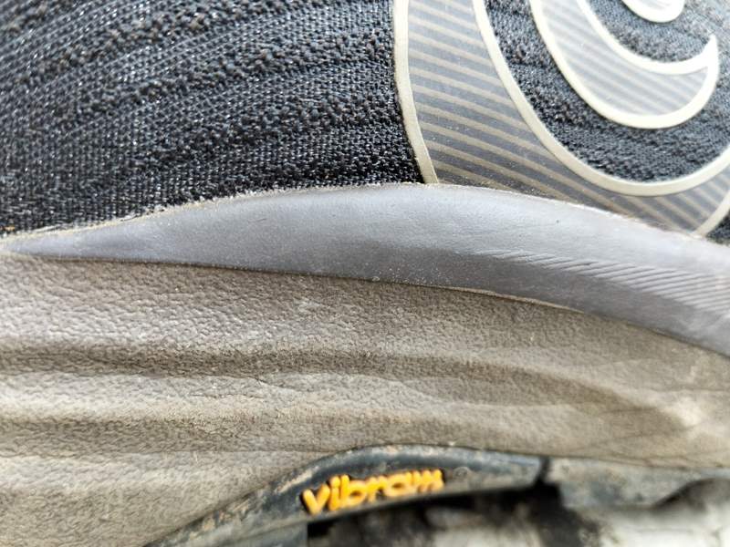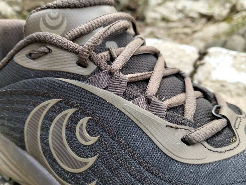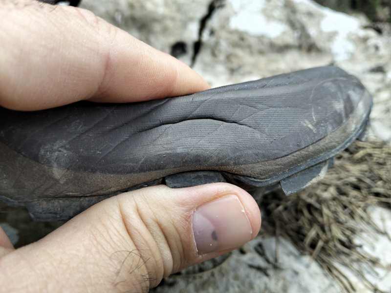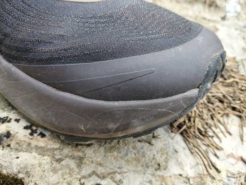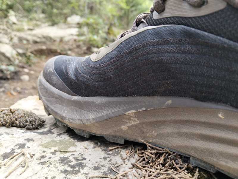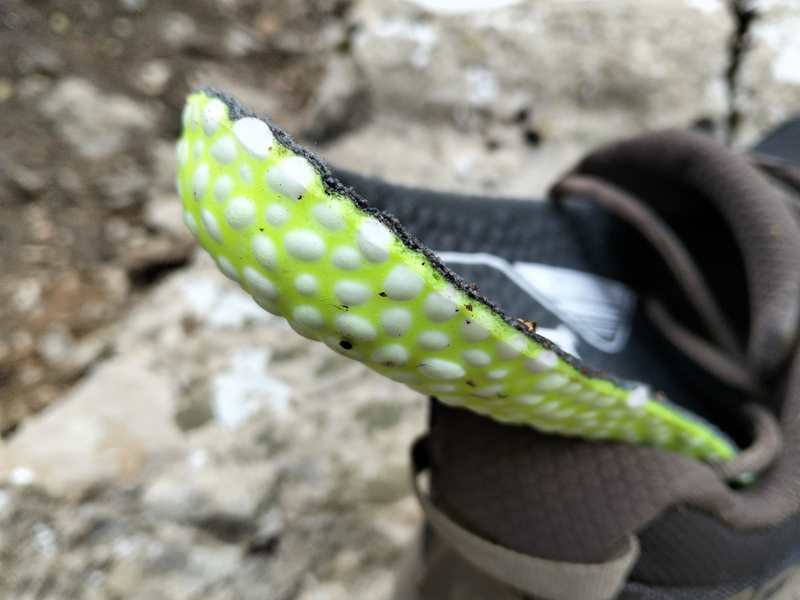 Il livello di protezione dell’intersuola è superiore a quanto ci si aspetterebbe da una struttura con soli 28cm di spessore e priva di rock plate, al pari di quella di scarpe più gommate, anche di 8mm in più, come Asics Fuji Trabuco, La Sportiva Prodigio 2, la Brooks Cascadia 19 o la Merrell Agility Peak 6. Sicuramente un fattore dovuto alla presenza della soletta interna in TPU.