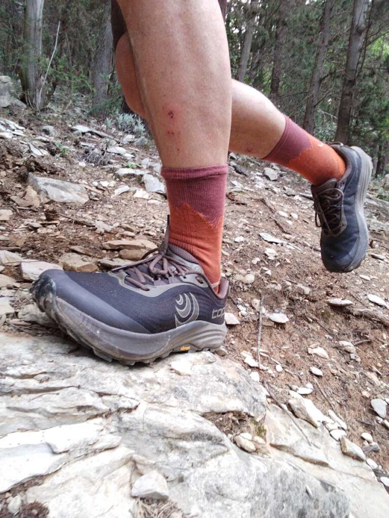 Con la Topo Athletic Pursuit 3 si è portati ad assumere una diversa postura che favorisca questo tipo di passo, ma in maniera minore rispetto a quanto ti spinge a fare la Topo Athletic Terraventure 5, che non la sua minor gomma e la minor morbidezza, ti costringe veramente ad effettuare un passo più bilanciato sul meso piede, per quanto abbia un drop più alto, anche se di soli 3mm.